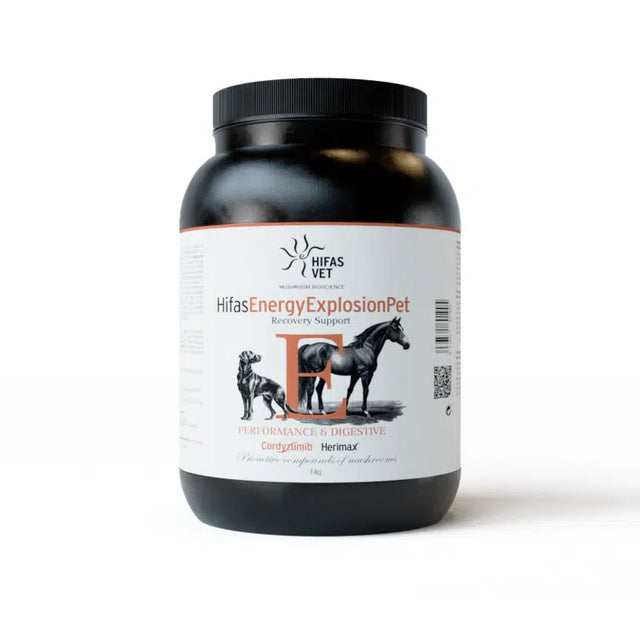 Hifas Energy Explosion Pet est une formule naturelle conçue pour favoriser les performances et la digestion des animaux de compétition. Il contient des champignons fonctionnels et des extraits de plantes dont les molécules bioactives soutiennent les niveaux d'énergie et le microbiote.