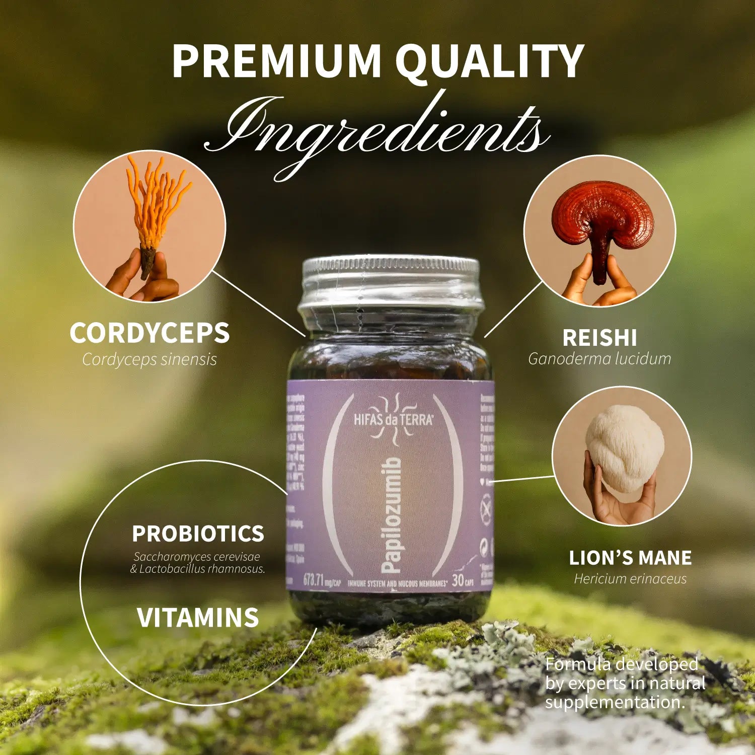 Papilozumbib is a food supplement formulated mainly with Reishi, Cordyceps, Lion's Mane, minerals (zinc and selenium), vitamins (A, C, D3 and E) and lactobacillus probiotics that contribute to the normal functioning of the immune system and the maintenance of the mucous membranes.