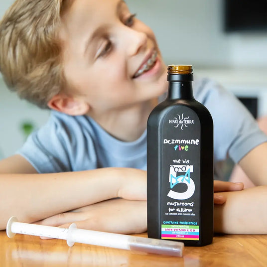 Dr Immune Five contient des bêta-glucanes qui contribuent à améliorer l'activité immunitaire *. Il contient aussi des prébiotiques et vitamines D et C qui contribuent au fonctionnement normal du système immunitaire. Il s'agit d'un complément alimentaire liquide pour les enfants à base d'extraits purs des 5 grands champignons : Reishi, Champignon du Soleil, Pleurote, Chaga et Shiitake.